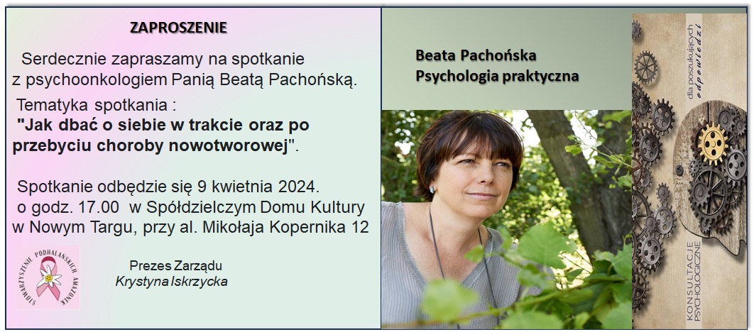 Spotkanie z psychoonkologiem p. Beatą Pachońską Tematyka spotkania: "Jak dbać o siebie w trakcie oraz po przebyciu choroby nowotworowej" Spotkanie odbędzie się 9 kwietnia o godz 17.00 w Spółdzielczym Domu Kultury. Poprzedni artykuł Następny artykuł