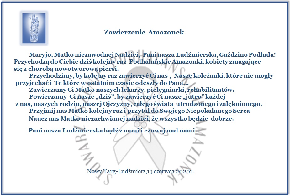 13 czerwca 2020r. odbyła się Msza św. w Ludźmierzu w ramach VIII Pielgrzymki Amazonek w intencji tych, którzy zmagają się z chorobami nowotworowymi oraz coronawirusem. Mszę odprawił ks.mgr Jerzy Filek- kustosz sanktuarium.
